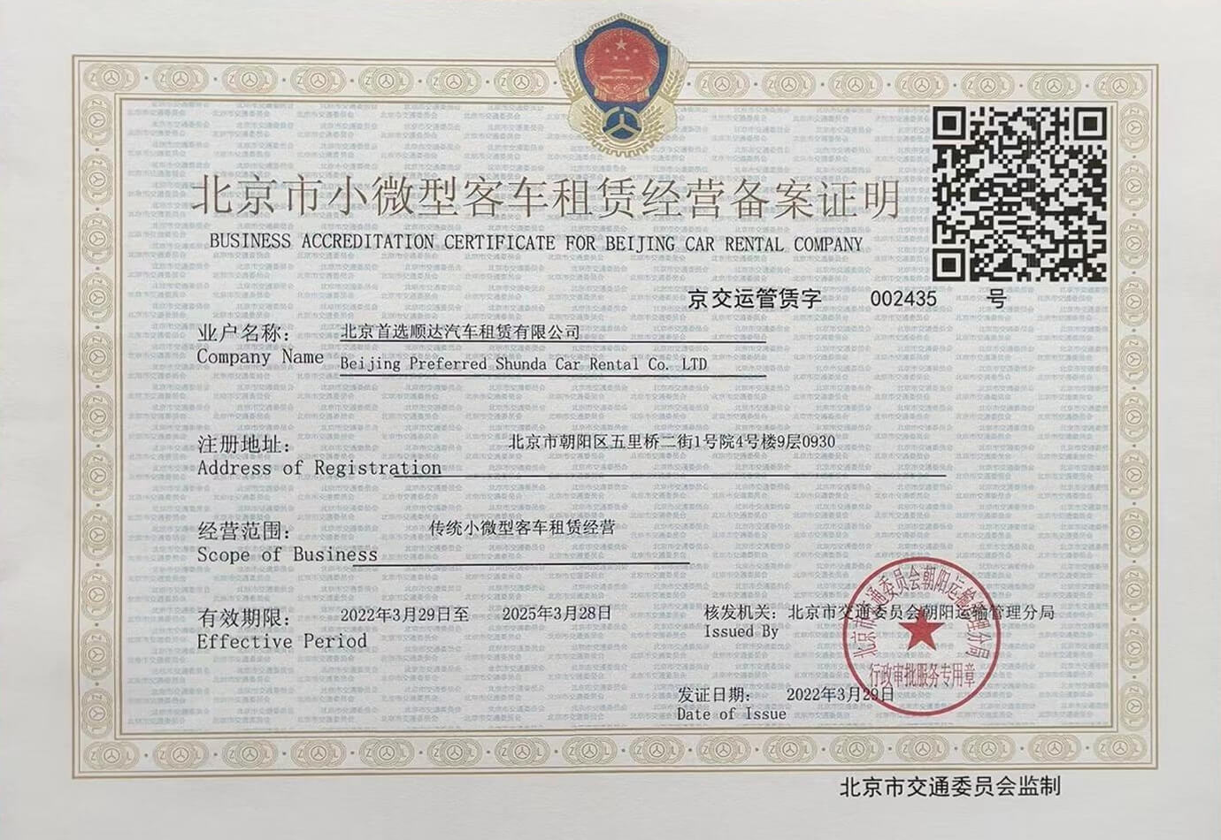 北京首選順達汽車租賃有限公司 一 經營備案證明