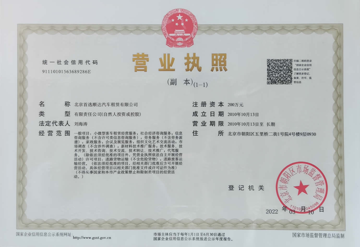 北京首選順達汽車租賃有限公司 一 營業(yè)執(zhí)照